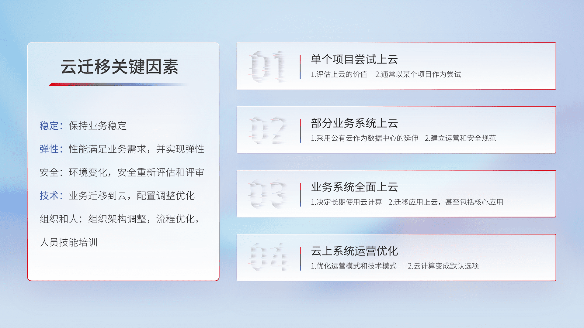 结合实际业务,,,,从规划设计、、、、云平台选型、、云原生改造、、数据迁移、、、集成交付,,,,迁移全过程为客户识别最佳上云路径,,,,做好风险识别管理,,,,设计网络架构、、、身份权限、、、安全审计合规、、、、操作审计、、日志审计、、、、监控告警策略、、、、多站点容灾设计等,,,对云上基础设施进行整体规划,,,,提升IT治理水平,,,,以满足弹性、、高可用、、、、高性能的需求。。。