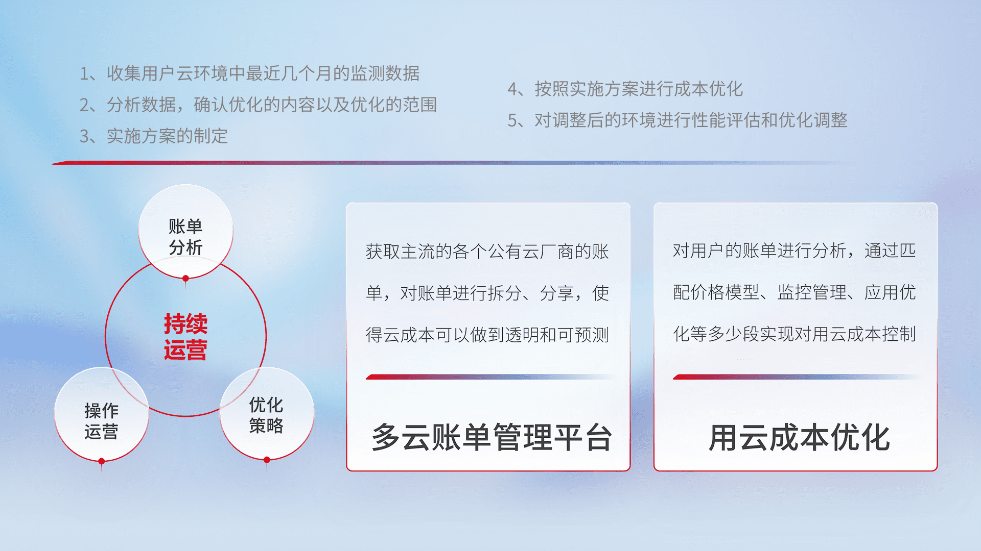通过多云纳管,,,,以统一的资源数据模型把客户的云资源进行抽象和封装,,,,进而实现对多云资源的统一操作,,,保障云资源管理的可靠性、、稳定性与可用性。。。量身定制化运维内容,,,,配置、、、开发运维、、、补丁管理、、、备份、、、监控、、、认证和访问管理、、、审计和日常巡检等,,,,保障在用云过程中的可靠度,,,,稳定度以及高可用率。。。